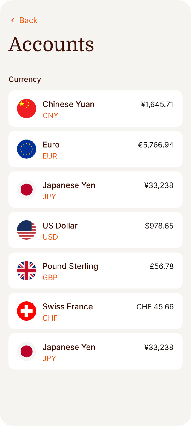 Hold and spend in 52+ currencies with real exchange rates—no markup, no friction.
